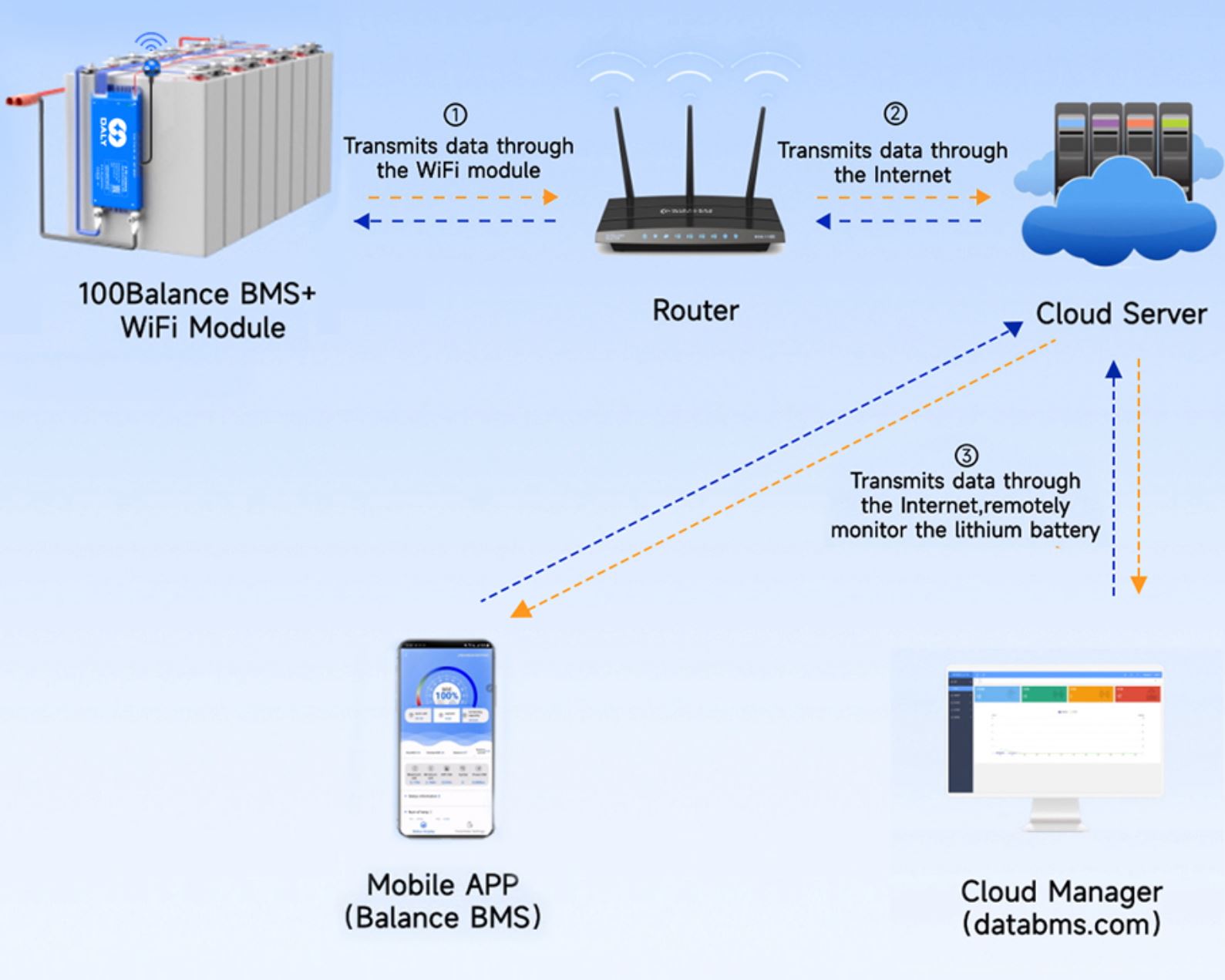Daly BMS ler için cep telefonu APP geliştirmiştir. Bluetooth, BMS'ye bağlandıktan sonra, BMS, pil verilerini, pil voltajı, toplam voltaj, sıcaklık, güç, alarm bilgileri, şarj Deşarj anahtarı gibi ilgili parametreleri gerçek zamanlı olarak izleyebilen cep telefonu APP'ye bağlanabilir.